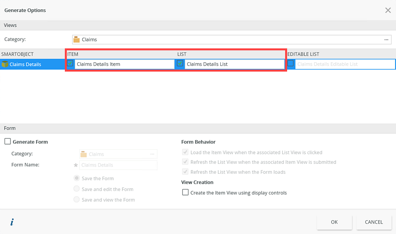 - Generate a Claims Details Item view and a Claims Details List view based on the Claims Details SmartObject.