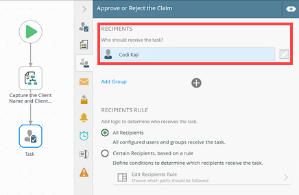 - On the Recipients tab select the user to receive the task. In this scenario, the task goes to Codi.