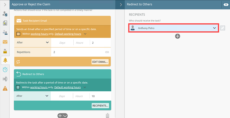 - On the Redirect to Others reminder, enter the time value when the task should redirect to a different recipient. In this scenario, after 10 minutes the task redirects to Anthony if no action was taken by Codi. Select the After option and type 10 in the minutes field. Click Recipients to configure the redirected recipient.