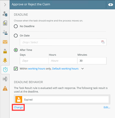 - To expire the task, you need to set a deadline. On the Deadline tab select the After Time option and type 30 in the minutes field. In this scenario, the task expires after 30 minutes if no action was taken by either Codi or Anthony.