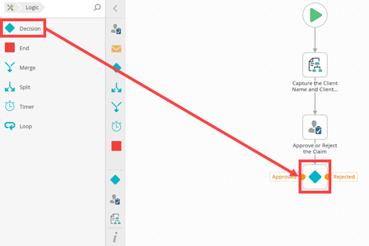 - From the Toolbox > Logic category, drag a Decision step onto canvas and connect it to the Approve or Reject the Claim task step. Notice that both task actions (Approved, Rejected) automatically show on the Decision step.