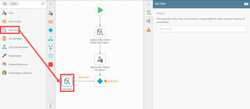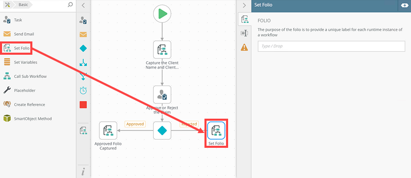 - From the Toolbox > Basic category, drag a Set Folio step onto the canvas and connect it to the Rejected action.
