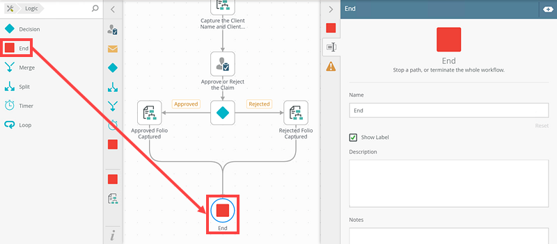 - From the Toolbox > Logic category, drag an End step onto the canvas and connect the Approved and Rejected actions to the End step.