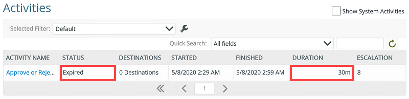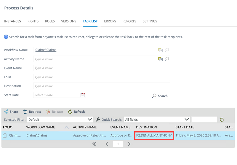 - After 30 minutes, no action taken by Anthony to open or complete the claim and the task expired. In Management > Workflow Server > Workflows > [workflow name] > Reports > Process Instance Detail > Activities notice the Expired status.