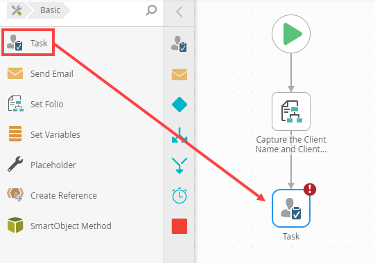 - Add the Task step from the Tool Box to the canvas and connect it to the Folio step.