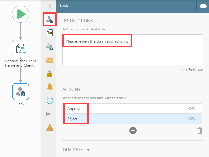 - On the Task tab in the Instructions section, type the following recipient instruction Please review the claim and action it. In the Actions section, select both Approved and Reject as the task actions.