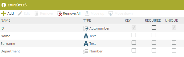 - Add ID,Name, Surname, and Department properties, using the following image as a guide: