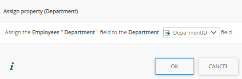 Create an association between the Employees and Department SmartObjects, assigning the Employees > Department property to the Department > DepartmentID property. This association links a single department to more than one employee (a one-to-many relationship).
