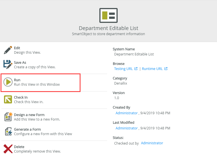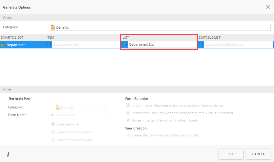 - On the Department SmartObject page, click Generate a View.