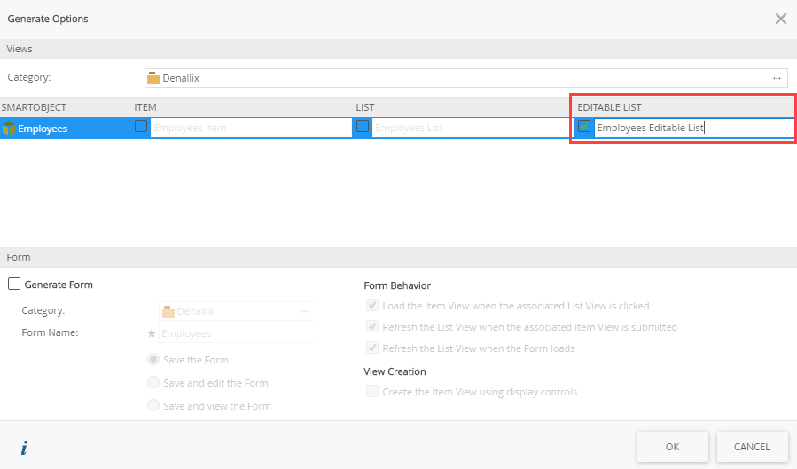 - On the Employees SmartObject page click Generate a View.