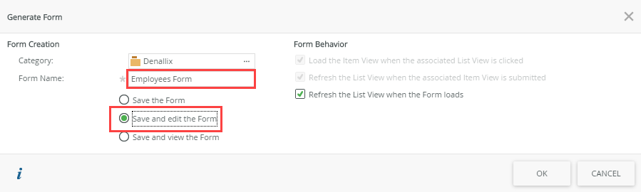 - Specify Employees Form as the Form Name, then select Save and edit the Form.