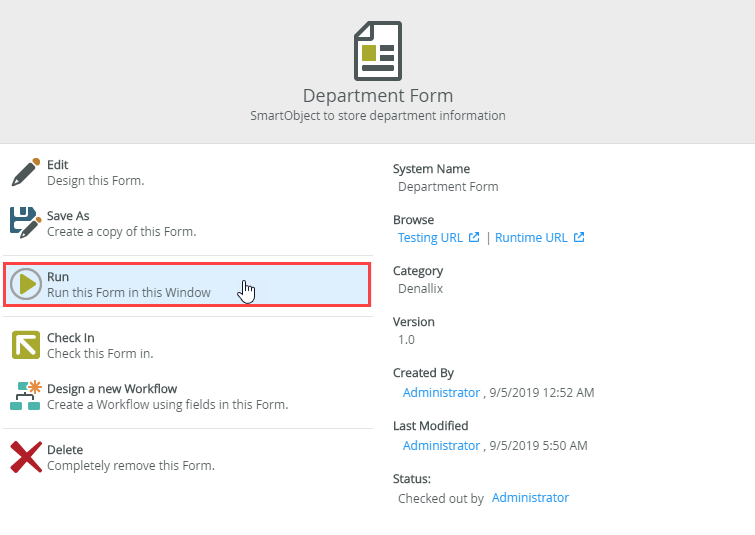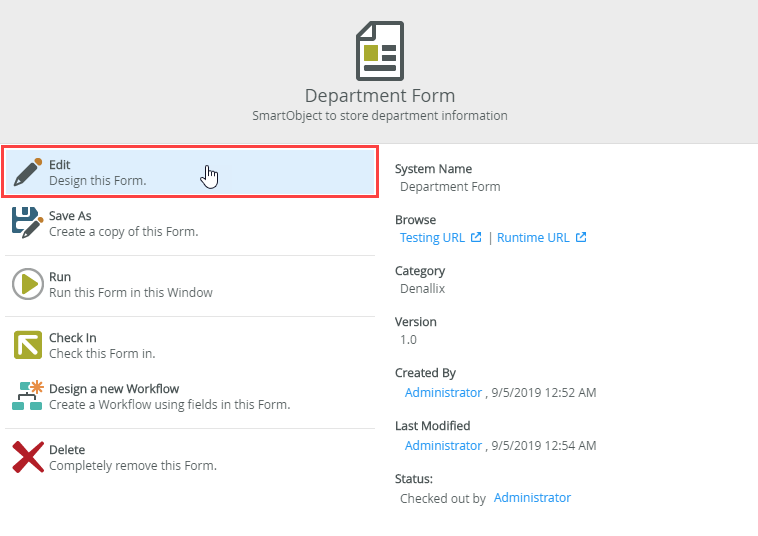 - In the Designer, browse to your Denallix category and right click the Department SmartObject.