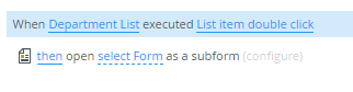 You create two SmartObjects (Department and Employees) and editable list views for each of the SmartObjects. You create an association between the Department and Employees SmartObjects, so that you can select the department when adding employee data. You then create standard list views and forms of both SmartObjects. On the Department form, you configure a rule to transfer the department ID as a parameter on the Employee form. You configure a rule on the Employee form to filter employees according to the department ID. When you double-click a department, a subform opens that shows you the employees of that department.