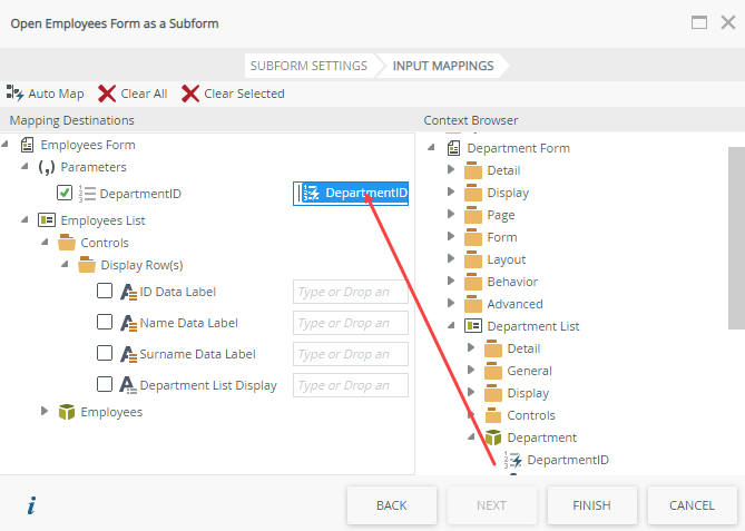 - On the input mappings page expand the Employees Form > Parameters and drag and drop the DepartmentID to the matching DepartmentID input property.