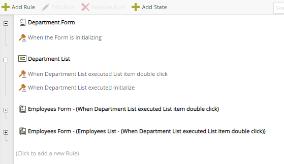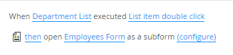 The steps below show you how to create the views and forms to display the information, and then configure rules so that when you double-click a department the employees form loads, displaying the list of employees in that department.