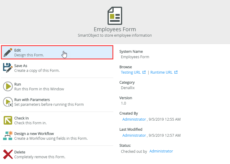 - In the Designer, browse to your Denallix category, right click the Employees SmartObject, and click Edit.