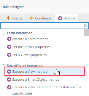 - In the rule Actions tab navigate to SmartObject Interaction, and click Execute a View method.
