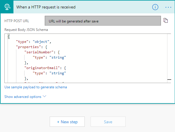 In Microsoft Power Automate, create a new flow starting with an HTTP request step. Configure the HTTP request step to receive a serial number, email address, and message from the SmartObject you create in Step 5.
