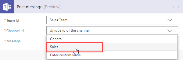 Configure a Microsoft Teams Post message action using the channelMessage field from the previous step.You must setup WebHooks in Microsoft Teams to access Teams in Microsoft Power Automate. See How to add connectors in Microsoft Teams for more information.
