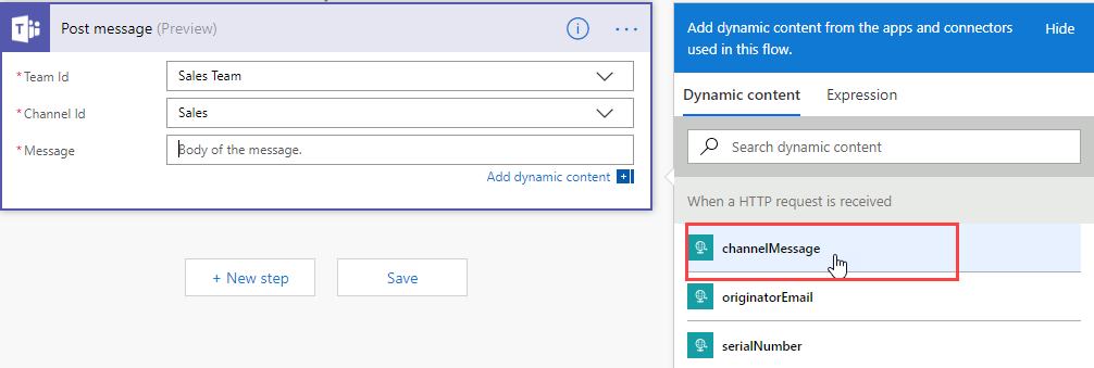 - Select the Message box and from the Dynamic content tab click channelMessage. This is the message field of the HTTP post from the workflow.