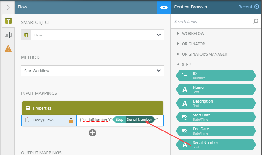 { "serialNumber":"", "originatorEmail":"", "channelMessage":"" } - Drag and drop the step Serial Number field from the Workflow Context tab of the Context Browser between the empty quotes after "serialNumber":