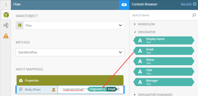 - Drag and drop the Originator's Email from the workflow context tab between the empty quotes after "originatorEmail":
