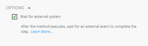 - Scroll lower on the SmartObject configuration, expand the Options, and check the Wait for external system option. This configures the step to wait for the Finish Server Event step called from your flow.