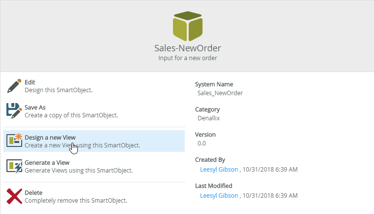 - Select Design a new View on the Sales-NewOrder page to create a new view from the SmartObject.