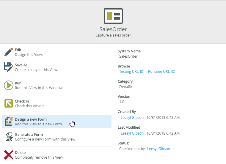 - Select Design a new Form on the SalesOrder page to design a new form containing the view.