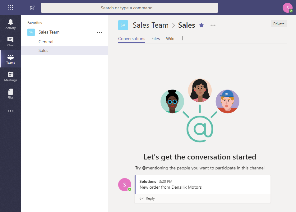 - Test your solution by completing a test Sales Order form. Once you submit the form, check that the Teams Sales channel is updated as shown here: