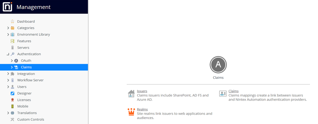 The Claims nodes in the Management Site are used to set up and maintain CBA configuration settings and allow you to add, edit or delete Resource types, Resources, and Realms and audiences , all of which work together to allow the product to consume Claims as a Relying Party from a CBA-capable identity provider.