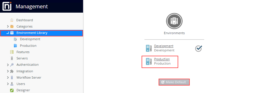 - On the Environment Library page select the appropriate environment and click Make Default.