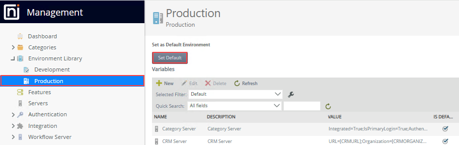From time to time, you may need to manage the existing values or add new values in the Environment Library. By default Nintex K2 is installed with two Environments: Development and Production, but your environment may have additional or different environments registered.