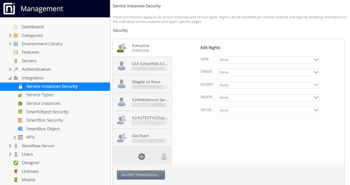 The Service Instances Security node is used to define design-time rules for service instances and service types to provide extra security to SmartObjects and increased granularity of control for the management of service types and service instances. This allows you as a member of the security administrators role to control who is allowed to manage service types and service instances and who can consume service instances within the design of their SmartObjects. The Create right is required to create a new service instance and the View right is required to use a service instance in a SmartObject. For more information see the Authorization overview topic.