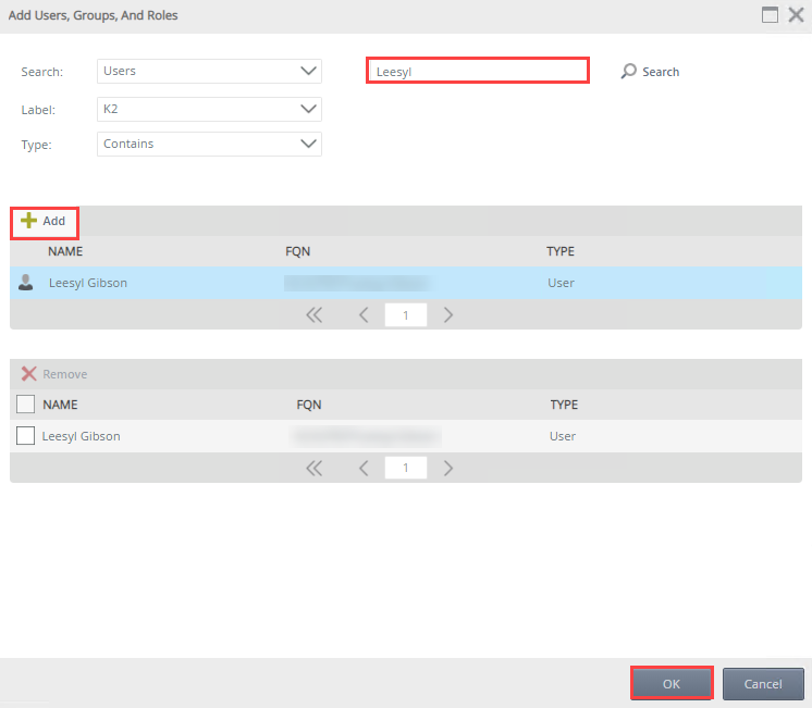 - On the Add Users, Groups, And Roles page search and add a user, group, or role. Click OK.
