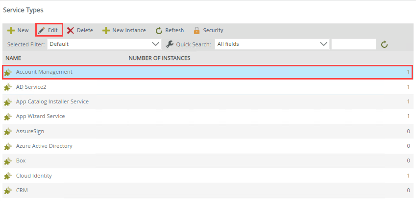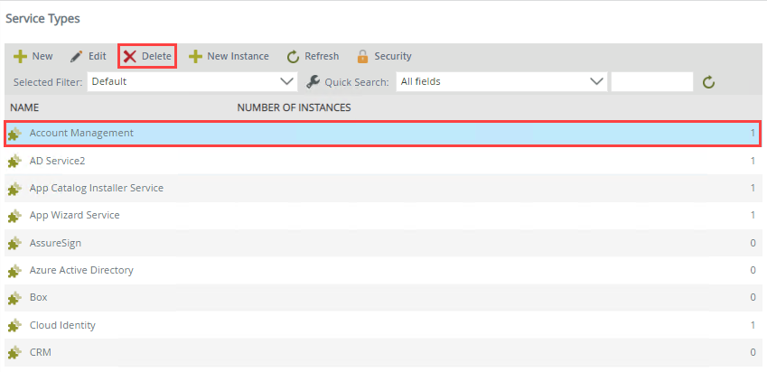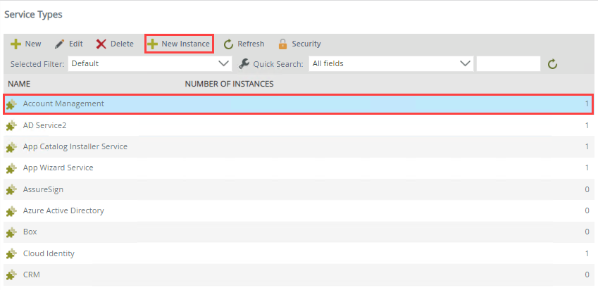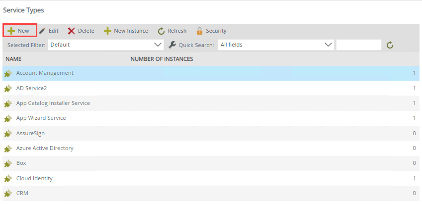 Clicking on Service Types returns a list of all the available service types and number of instances per service type in your environment. From the Service Types page, you