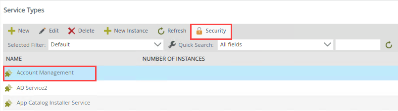 The Security button allows you to define design-time rules to control who is allowed to manage service types. Service types inherit rights from the service instances security level. See Authorization framework overview and Service instances security for more information about rights, inheritance, considerations, and best practices before assigning rights per service type.