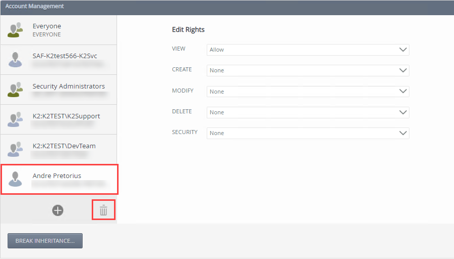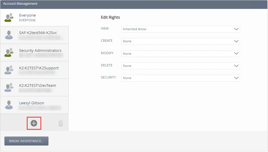 - Specify the user, group, or role's View, Create, Modify, Delete, and Security rights. If the user, group, or role has rights at the service instances security level, the following rights are available: Allow, Deny and Inherited Allow. If the user, group, or role does not have rights at the service instances security level or if the inheritance is broken the following rights are available: Allow, Deny and None.