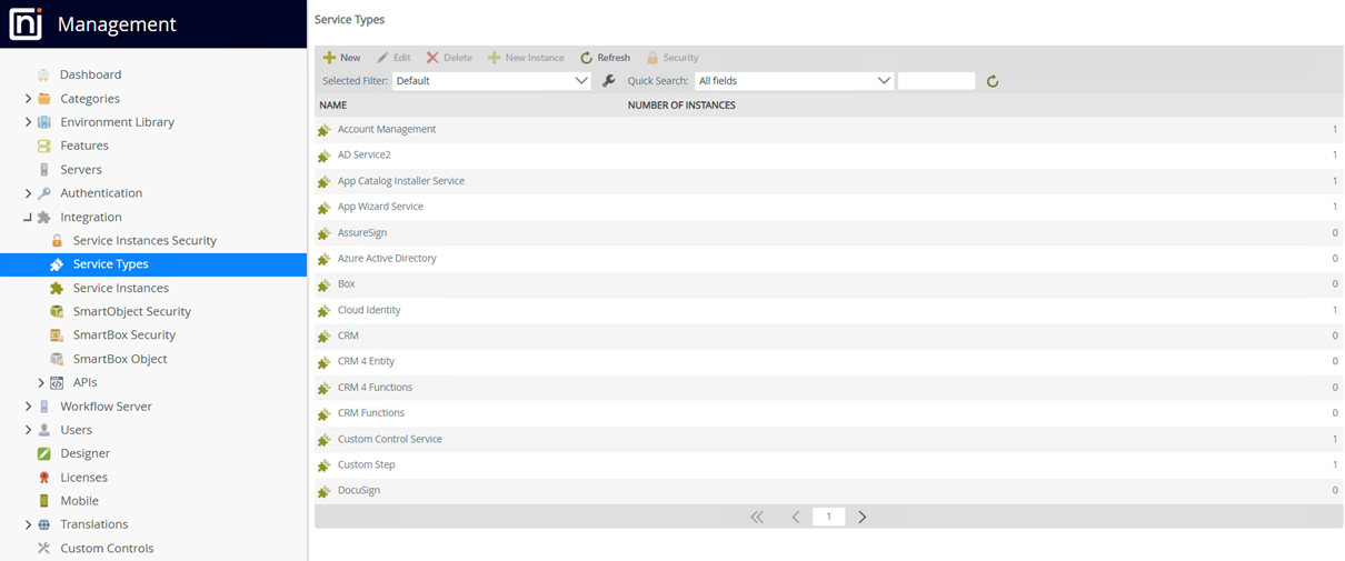Service types are connectors/adapters that allow the product to interact with some underlying system and expose objects in that system as SmartObjects. A service type allows the product to integrate with a technology, while Service instances of a service type to connect to specific instances of that system. Service instances are configured instances for a particular service type that point to an actual system, and you can have multiple service instances for the same service type that are configured to connect to different systems. For example, one instance of the SQL Server service type is configured to connect to your HR database while another service instance is configured to connect to your Finance database. You must configure service instances before developers and designers are able to create or use SmartObjects for that particular data store.