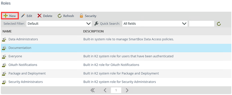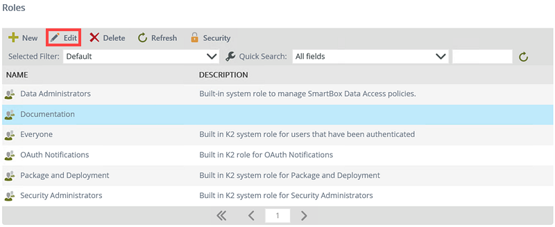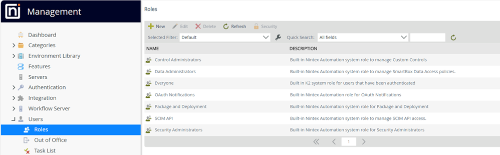 Use the Roles node to create, edit, delete or save roles. Roles are essentially groups defined in the product, and are most often used for assigning tasks or setting security. For example, perhaps it is not possible to define groups in Active Directory (AD) for workflow task allocation, because the AD administrators are unwilling to define groups used only by applications. Or perhaps you to create a group that contains users authenticated through different authentication mechanisms, in which case you cannot define the group in AD.