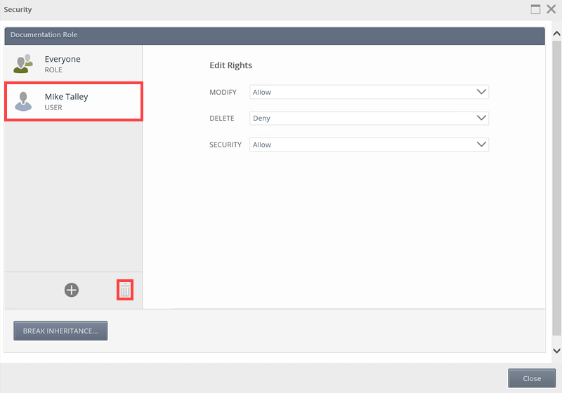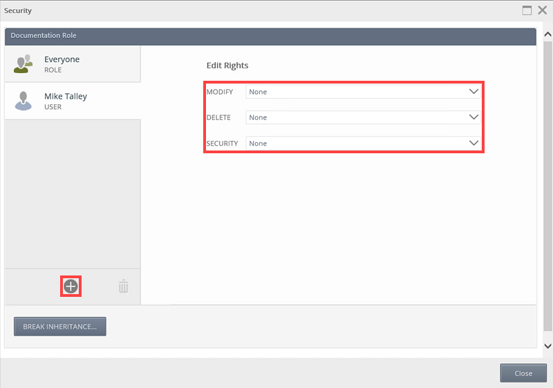 - Specify the user or group's Modify, Delete and Security rights. Three options are available: Allow, Deny and None.