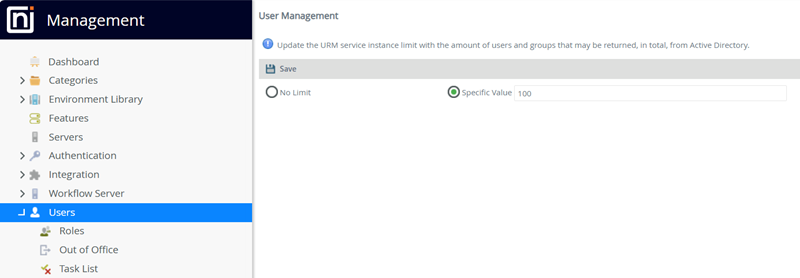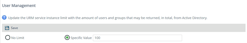 - On the User Management page, select either the No Limit or Specific Value option to configure the amount of users and groups that may be returned from Active Directory.