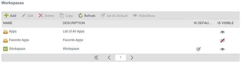 Use the Custom Workspaces node to add, edit, delete, copy, set as default, and hide/show additional workspaces in Workspace (Desktop and Mobile).