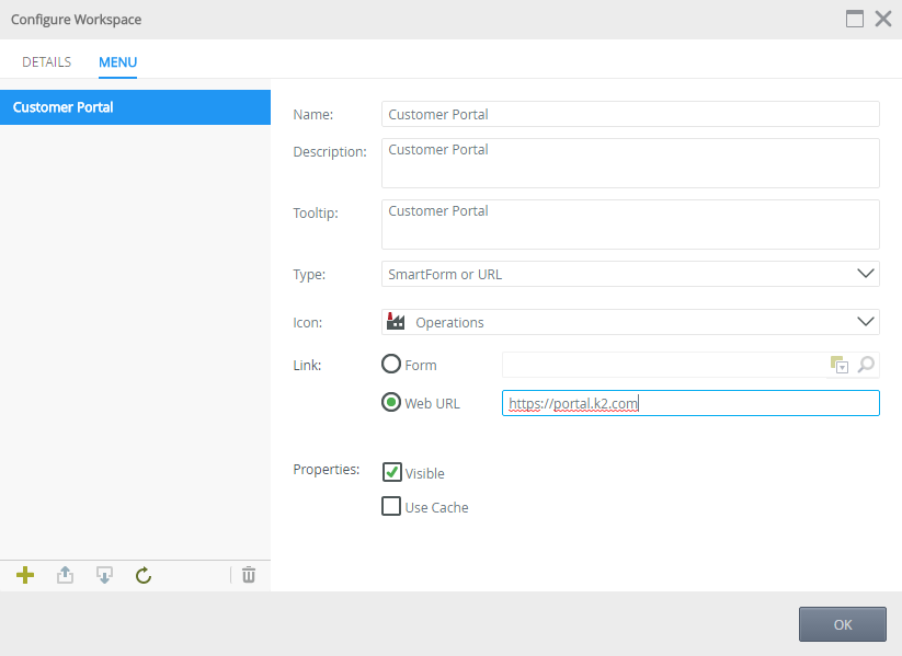 | Properties | Visible | This option is enabled by default. Deselect this option to hide the link on this workspace page |