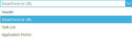 | Type | Select the type of link from the drop down. Use the Header option to configure this link entry as a simple header on the workspace menu. Use the SmartForm or URL option to set this as an external link to a site or SmartForm. Use the Task List option to add the Tasks page as this link. Use the Application Forms option set this link ![]() |