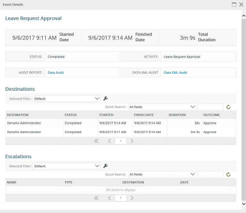 | Escalations | Displays a list of all escalations associated to the event by Name, Type, Destination and Date, and is sortable by clicking a column name. The returned data can be filtered via the Quick Search and by configuring a Selected Filter. |
