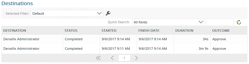| Destinations | Displays a list of all destination user associated to the event by Destination, Status, Started, Finished, Duration and Outcome, and is sortable by clicking a column name. The returned data can be filtered via the Quick Search and by configuring a Selected Filter. |