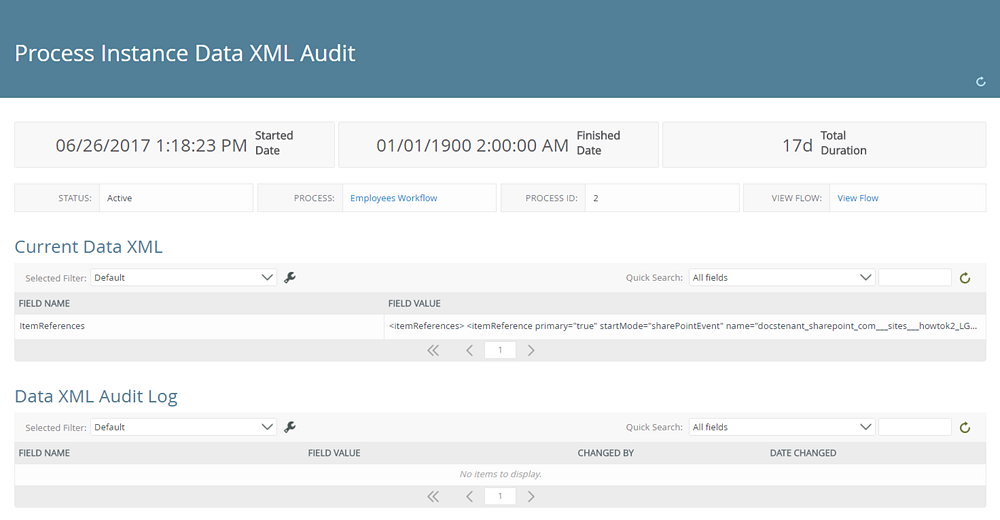 | Current Data XML | Displays all Data XML associated to the instance by Field Name and Field Value, and is sortable by clicking a column name. The returned data can be filtered via the Quick Search and by configuring a Selected Filter. |