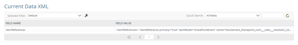 The Current Data XML section displays all data XML associated to the instance by Field Name and Field Value, and is sortable by clicking a column name. The returned data can be filtered via the Quick Search and by configuring a Selected Filter.