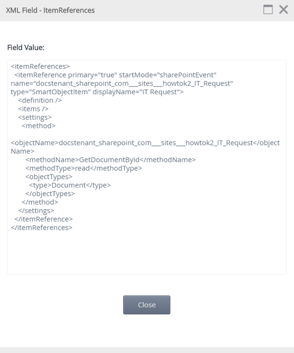 Double clicking on an item opens the XML Field - [Field Name] page, which displays the Field Value.